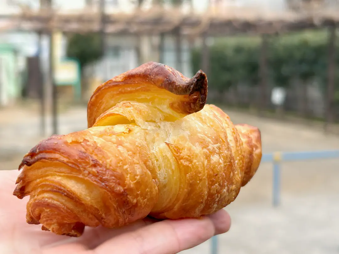 見て、このフォルム!もはやリーゼントですよ。売り場の写真を見返してみたら、表面は同じくしっかり焼かれているものの、ここまでツノってなかったです。ROCKな一期一会ということで、味も形もイケてるクロワッサンでした。