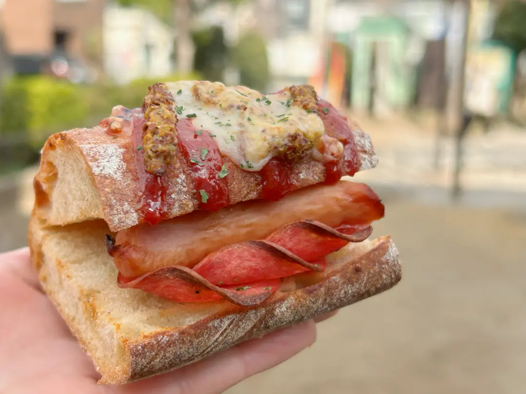 食べやすいサイズのバゲットに、サラミ、ソーセージが挟まっています。波打つサラミが綺麗。味付けはケチャップ、粒マスタード、チーズ。日によってサンドの中身は違うのかも。