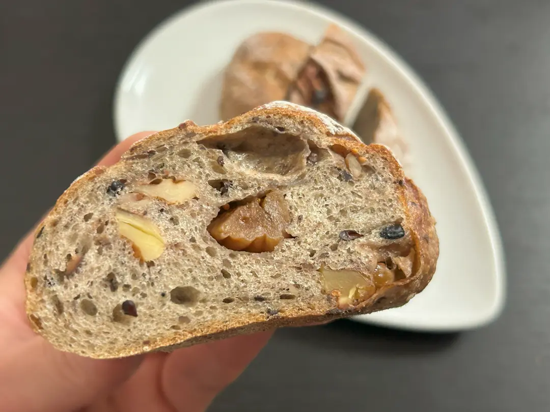 パンはギュっと詰まっていてきめ細やか、五穀米、特に黒米の香りが芳ばしい。いちじくは甘み抑えめで食事にも合いそう。