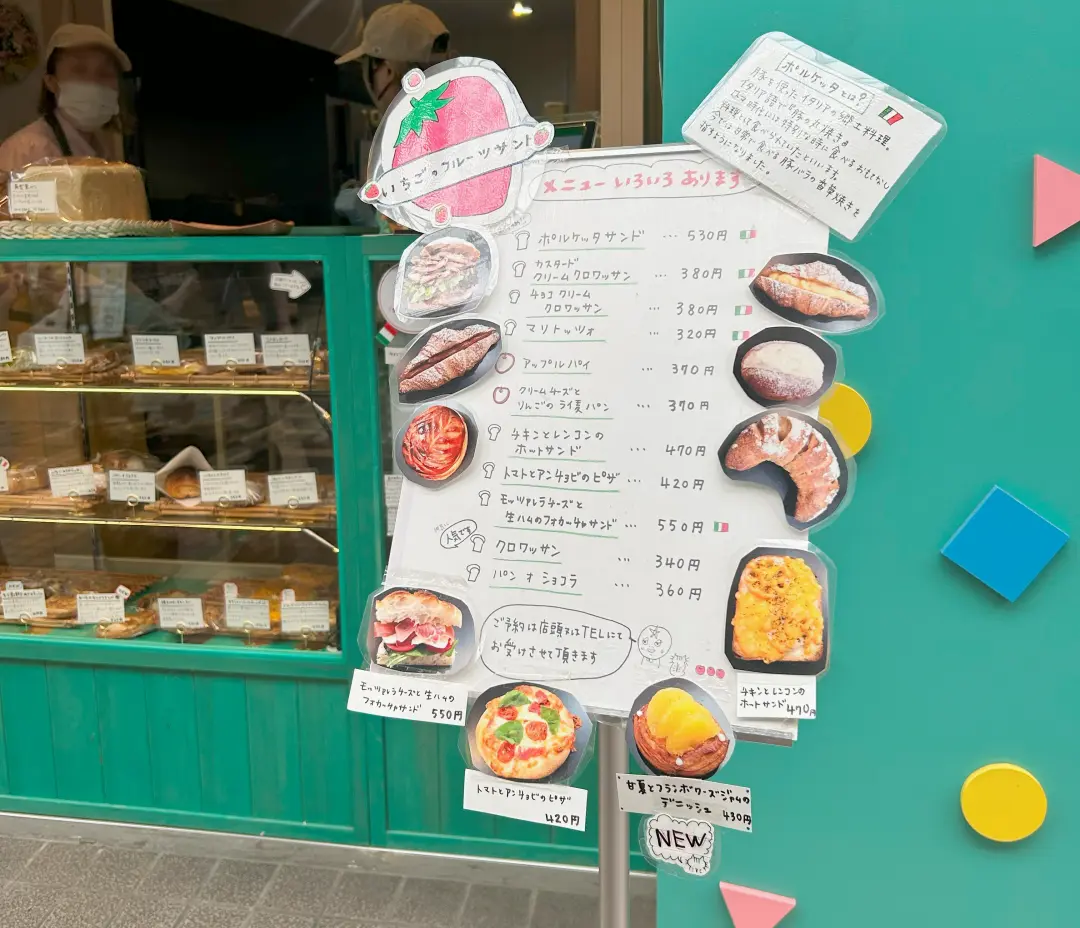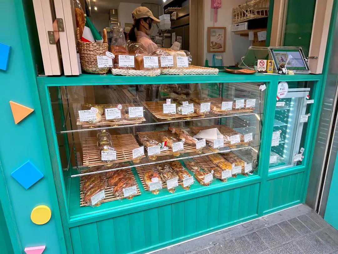 ブルーグリーンの壁にポップでカラフルな外観。シェフのパートナーさんのデザイン。保存料は不使用、厳選された食材を使ったパンが並びます。
