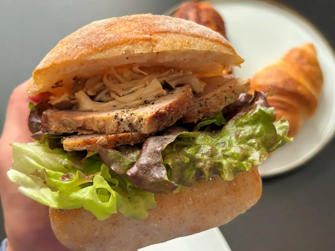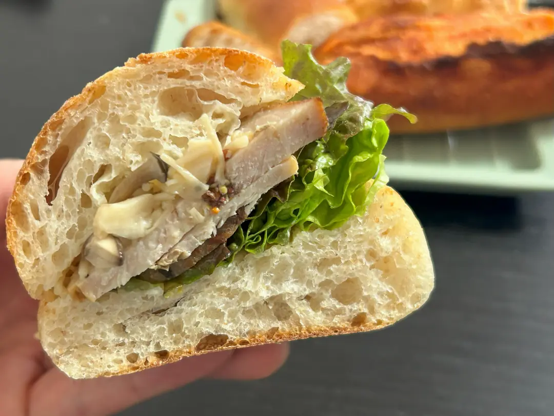 ポルケッタは、豚肉を使ったイタリアの郷土料理。厚切りの豚肉の香菜焼き、チャバタに挟まれているのは、しっかりめにガーリックソテーされたシメジ・エノキ、粒マスタード、レタスもりもり。