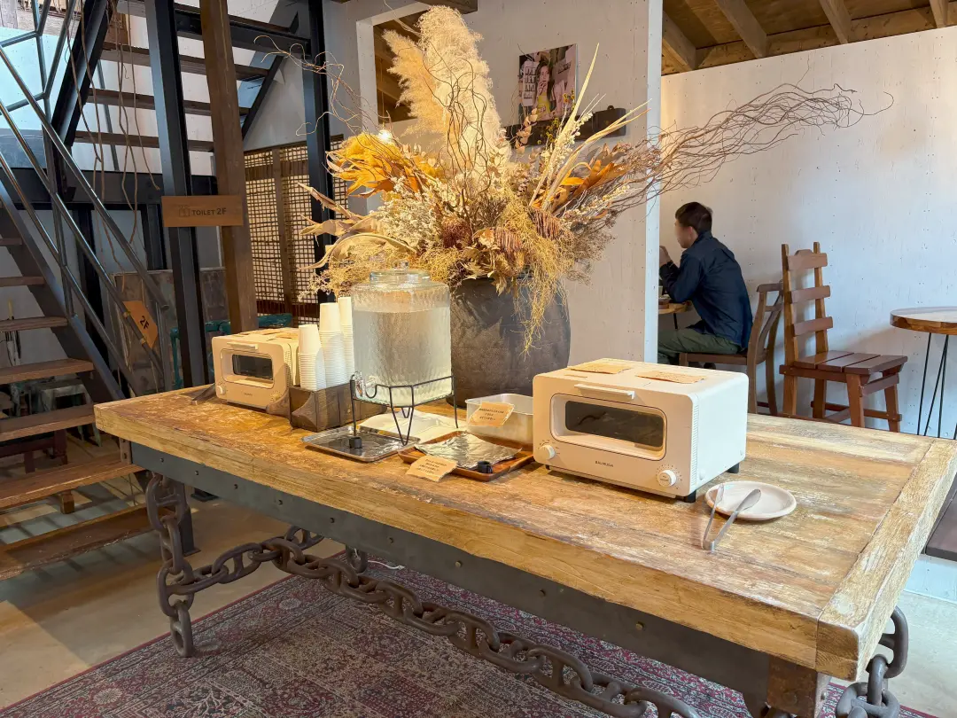 温められるようオーブントースターが設置されていて、1階にも2階にもイートインスペースあり。おとなりのお客さんに気を遣うことがないくらい余裕ある配置になっています。
