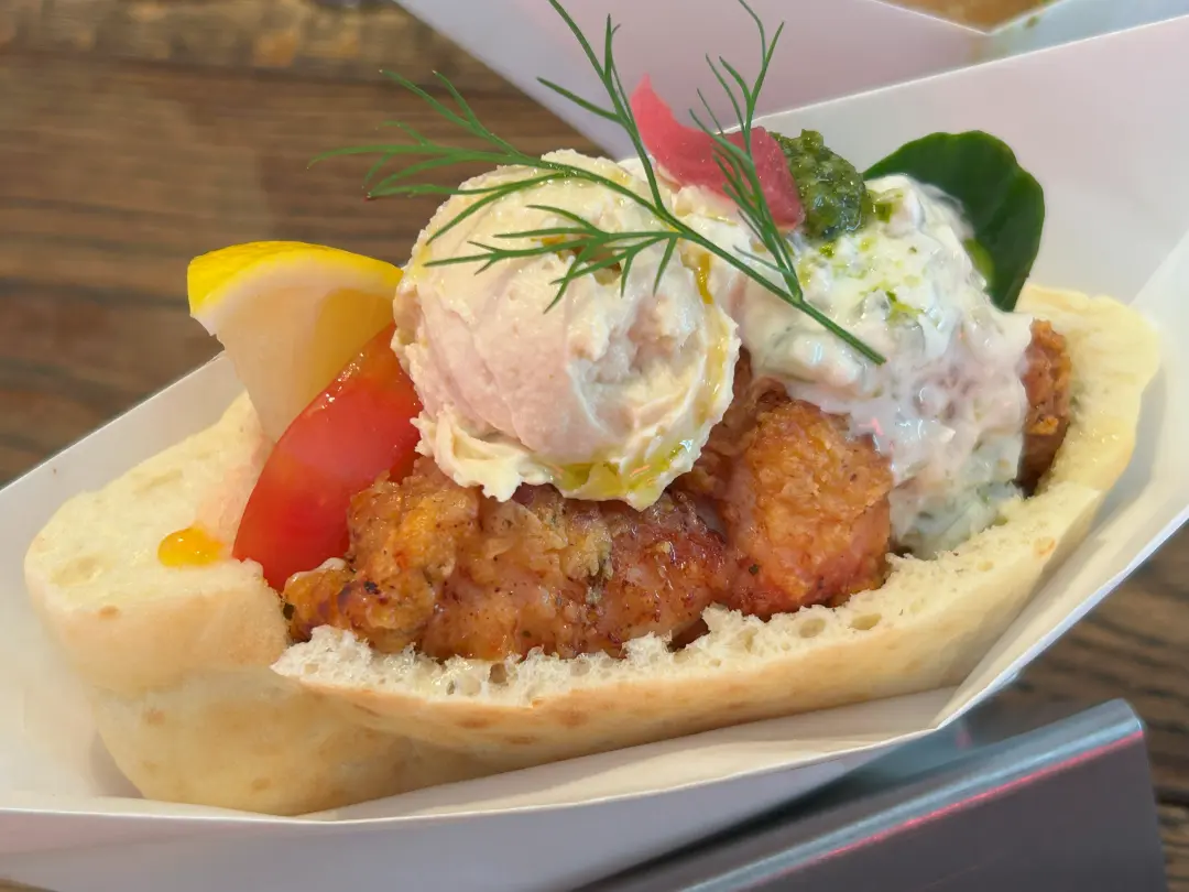 バターミルクとスパイスを合わせてまとわせたフライドチキン。バターミルクの代わりに、クレームエペスという発酵クリームを使用したランチソース。パンはベーシックなピタパンを選びました。