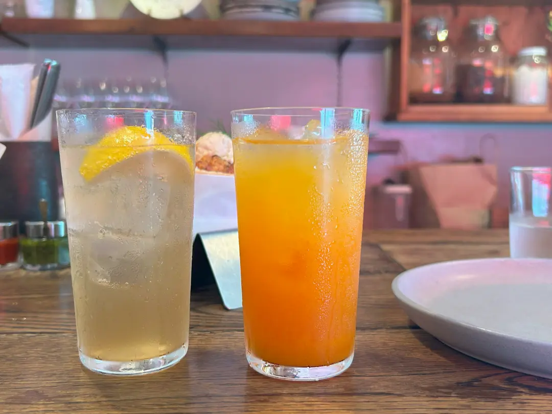 自家製のエルダーフラワーレモンソーダは爽やかで甘さ控えめ。微炭酸なので炭酸が苦手な方も楽しめるのでは。もうひとつは、グレープフルーツターメリック。一見オレンジジュースのような色ですが、ピンクグレープフルーツをベースに、ターメリック、レモンジンジャーティー、はちみつ、仕上げにメースを使用。複雑な味わいが楽しめました。夏にピッタリでピタパンとの相性もよき。