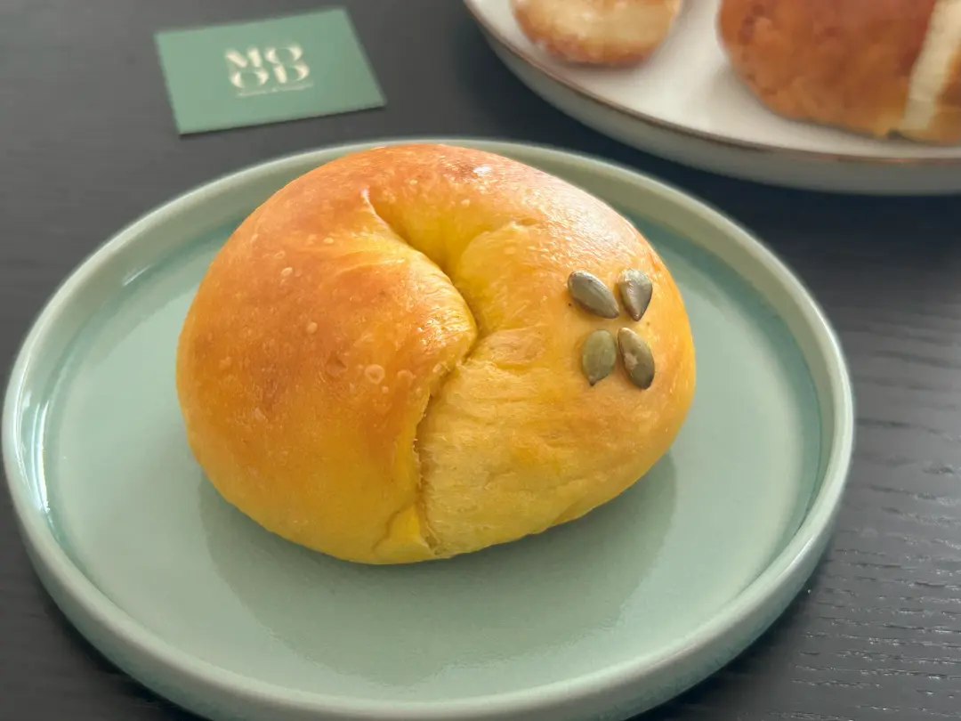 かぼちゃペーストを生地に練りこんだパンプキンベーグルの生地に、かぼちゃあんを巻き込んだ一品。アクセントにかぼちゃの種とかぼちゃづくしの人気商品。