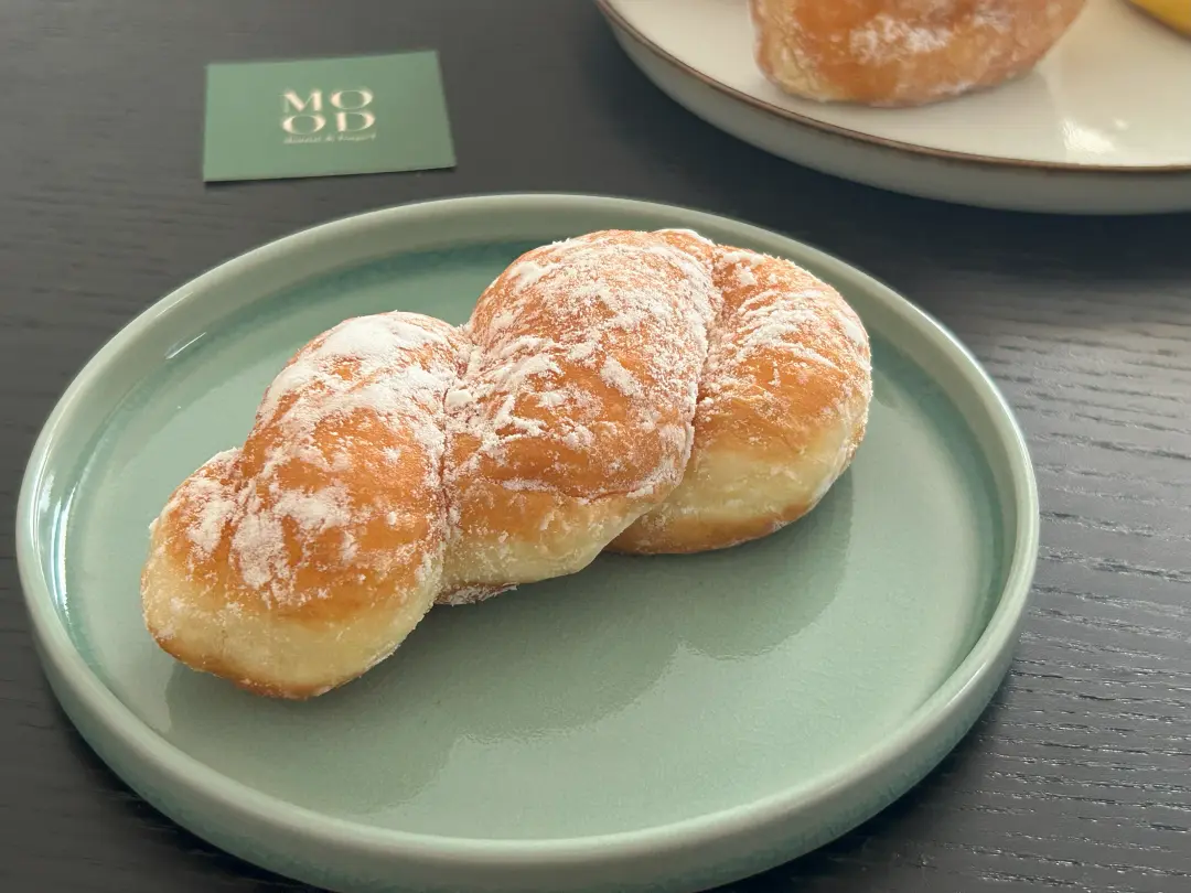 韓国のドーナツ。MOODでは食パン生地を使用してお店のアレンジを加えているそう。ふわっふわで生INドーナツとはまた違ったもちもち感、ヒキもある。