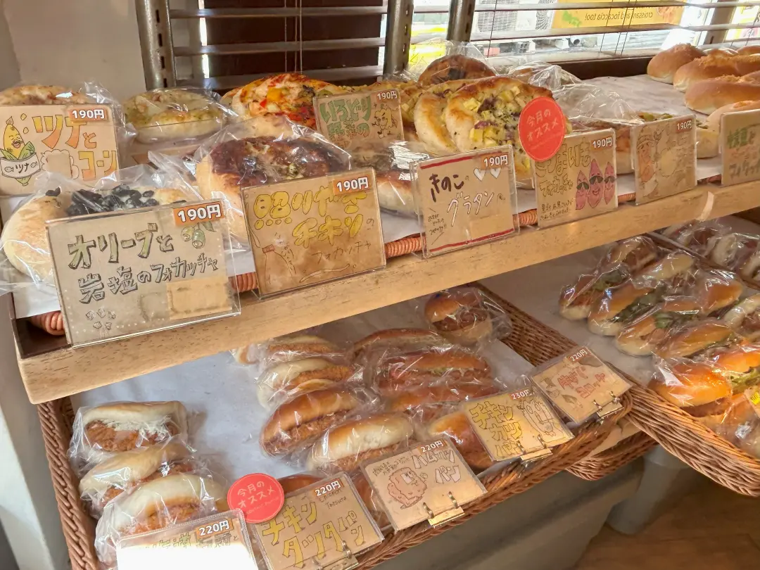かわいらしい手書きPOP。店員さんがこまめにパンを補充している姿に活気を感じます。