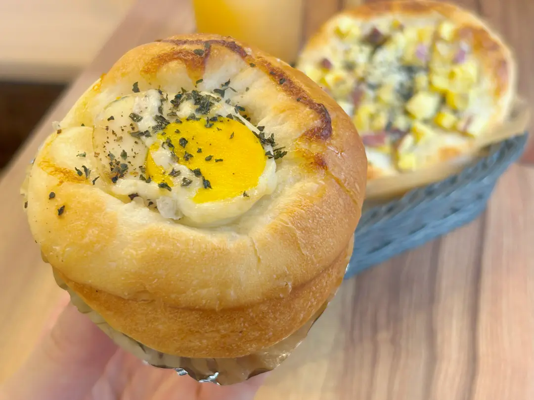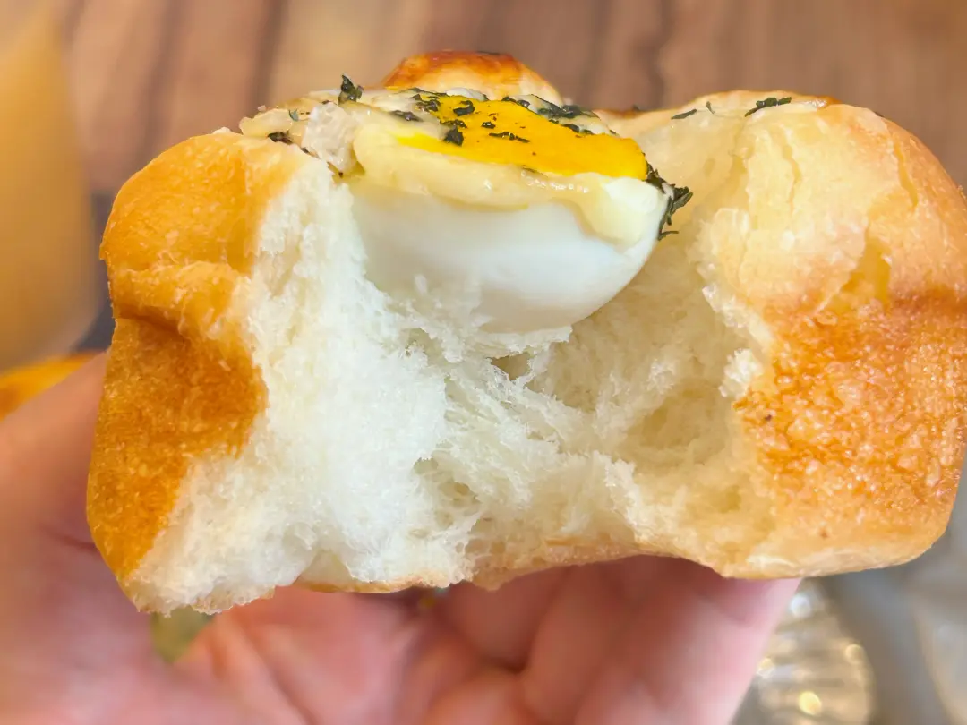 ころんとした筒形のパンに、塩味が効いたゆで卵が顔をのぞかせています。焼き色はやさしく、秋のお月見を思わせる愛らしさ。パン生地はふわふわでやわらかく、ほんのり甘さが広がります。