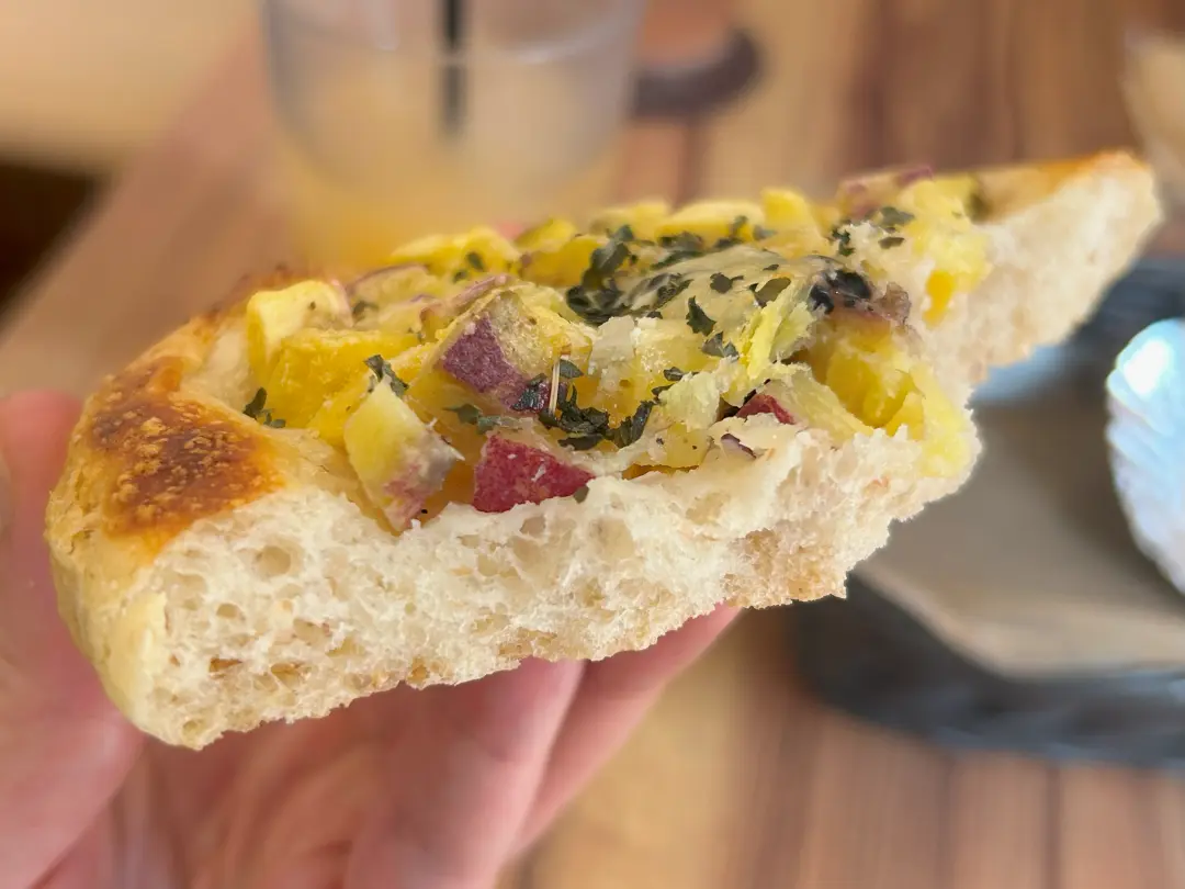 平らなフォカッチャ生地に、細かくカットしたさつまいもと粉チーズ。フォカッチャは噛みごたえがあり、もっちりとした弾力が特徴。