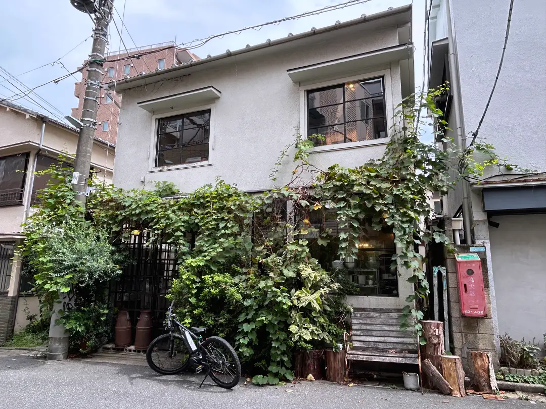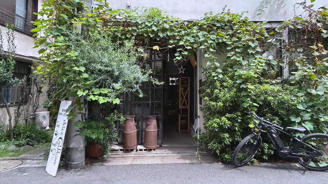 路地に入っていくと1階部分が緑に覆われた建物あり。看板がないと通り過ぎてしまいそう。