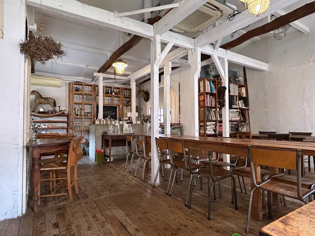 階段を上がるとカフェフロア。天井が高く、木の梁が見える空間。アンティーク調の椅子や木のテーブル、窓から差し込む日差しとやわらかい照明が落ち着いた時間を作っています。