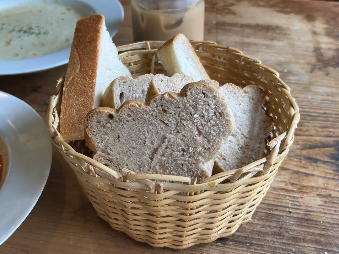パンが3種。厚切りの食パンは軽くトーストされていて、やわらかしっとり。チーズが入った丸パンはふんわり食感。もうひとつは渦を巻いているような見た目で全粒粉入りパンでしょうか。生地細かめ。刻んだドライフルーツが練り込まれていてほんの〜り甘み感じる仕上がり。