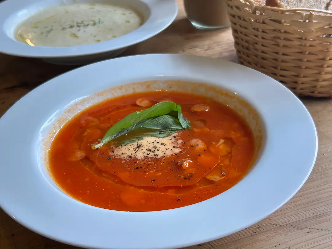野菜の旨みが溶け込んだ素朴な仕立て。ちょうどよい酸味。豆ではなくソーセージがたくさん入っていて珍しい。トマト、玉ねぎ、人参、バジルと具だくさん。上からチーズもかかって満足感あり。