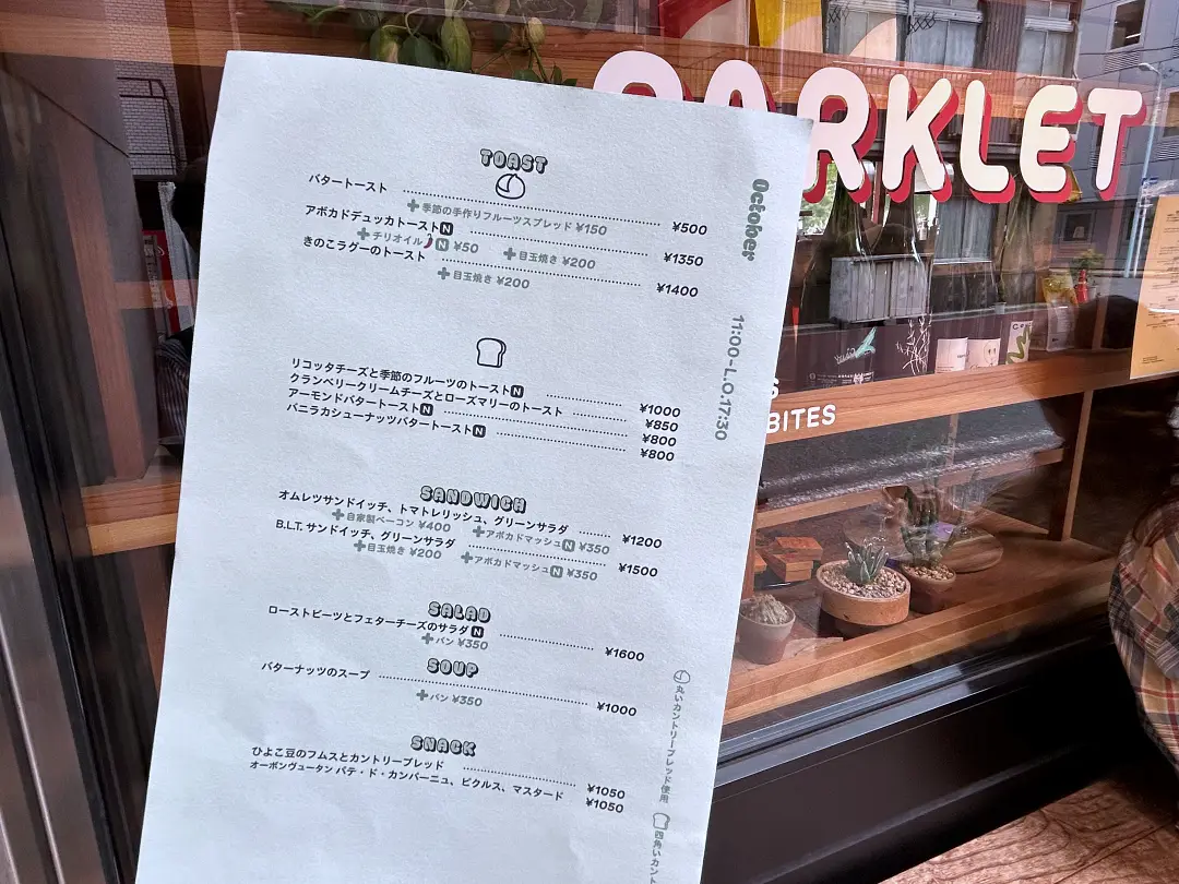 店名の「Parklet(パークレット)」は、「小さな公園」「憩いの場」を意味する言葉。また、街の歩道や駐車スペースを活かしたパブリックスペースの呼称でもあります。その名の通り、公園と店舗が自然につながるような設計。大きな窓越しに見える緑が街の風景に溶け込み、心地よい開放感があります。