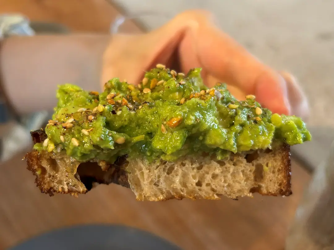 表面には砕いたナッツと白胡麻が散らされていて、食感のアクセントに。ひと口ごとにアボカドのまろやかさとナッツの香ばしさが広がり、パンの力強さとよく合います。あっという間に食べ終えてしまいました。