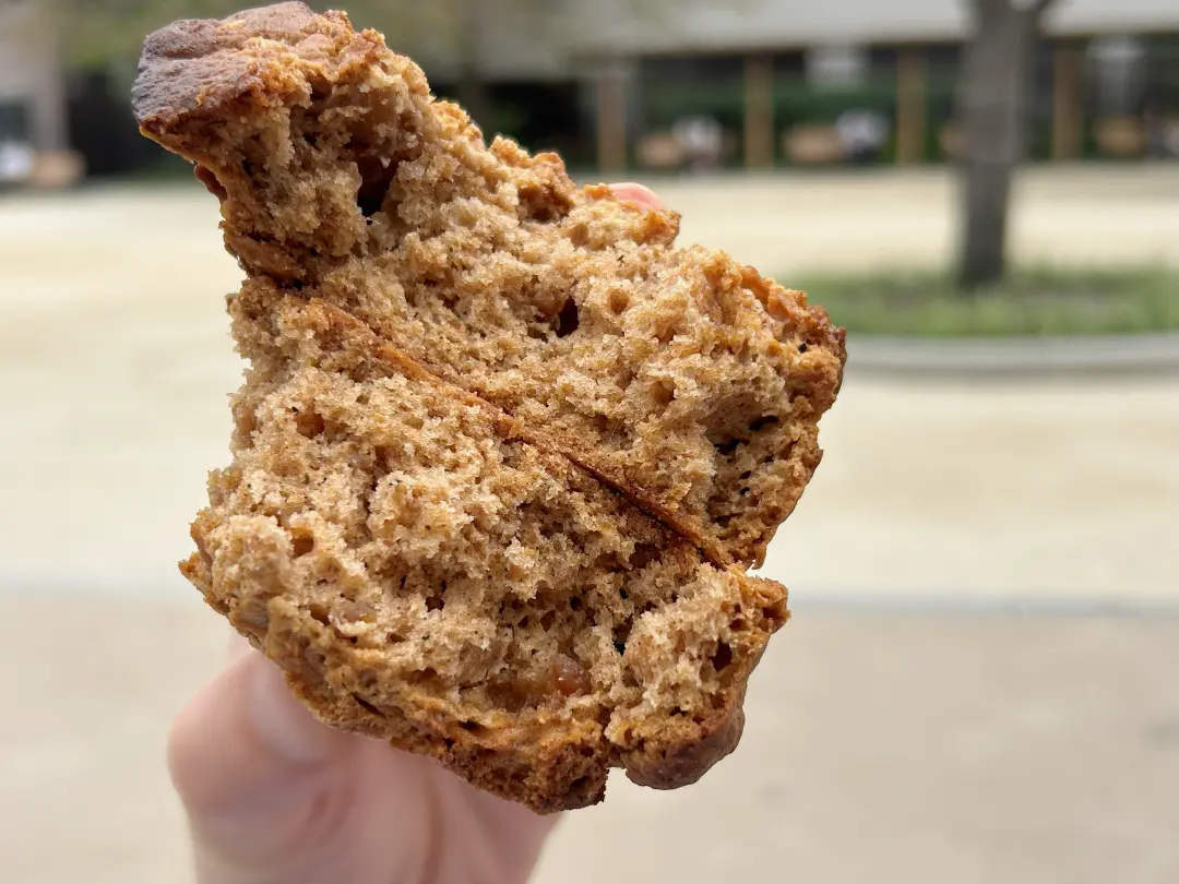 早速、公園のベンチにて。手のひらほどの大きめサイズで、外はざくっと、中はほどよくしっとり。噛むと時々ガツンとくるジンジャーの辛みが心地よく、カルダモンやシナモンの香りもふわりと広がります。
