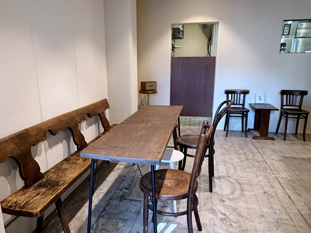 店内の様子。アンティーク調のテーブルとチェア。ウッディーで落ち着いた雰囲気。