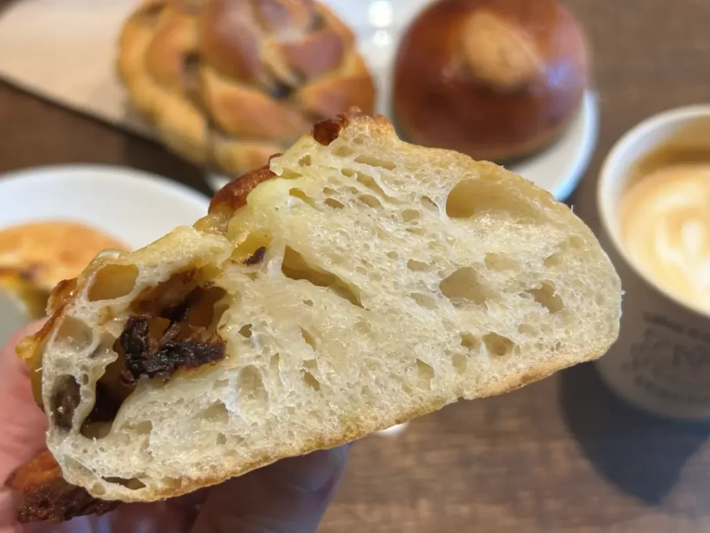 意外だったのは、中にドライトマトのオリーブオイル漬けが練り込まれていたこと。酸味と塩気がアクセントになり、パンそのもののおいしさを引き立てていました。カリカリに焼けた“おまけチーズ”もうれしいポイント。
