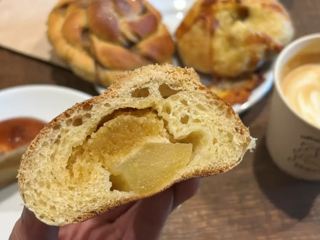 上には小さなクッキーがちょこんと乗り、中には甘く煮たりんごと軽めのアーモンドダマンド。「りんごパン」の名前から素朴な感じかと思いきや、ダマンド入りでしっかりスイーツパンに。
