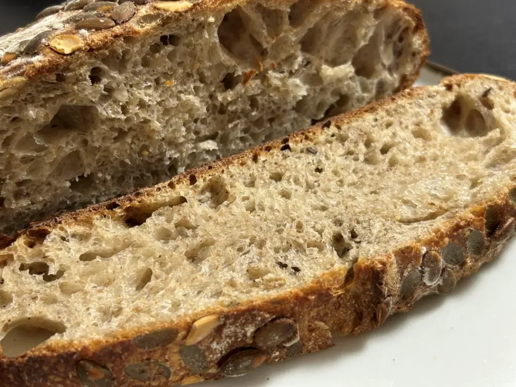 新麦チクゴイズミ10%を含んだ国産小麦、全粒粉、ライ麦がブレンドされたカンパーニュ。表面にはひまわりの種・かぼちゃの種がたくさん。クラストは厚くしっかりめ。長時間低温発酵で焼き上げているため、中はしっとり、適度にムチっと、自然の甘みあり。