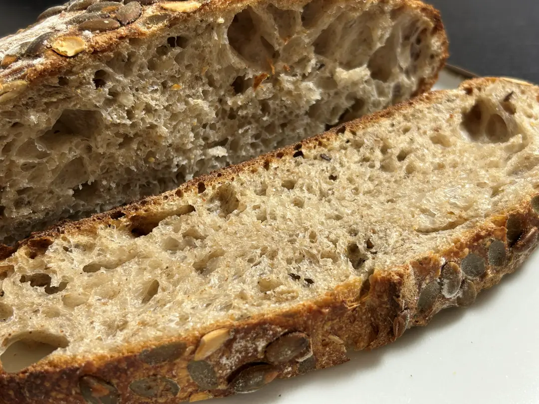 新麦チクゴイズミ10%を含んだ国産小麦、全粒粉、ライ麦がブレンドされたカンパーニュ。表面にはひまわりの種・かぼちゃの種がたくさん。クラストは厚くしっかりめ。長時間低温発酵で焼き上げているため、中はしっとり、適度にムチっと、自然の甘みあり。
