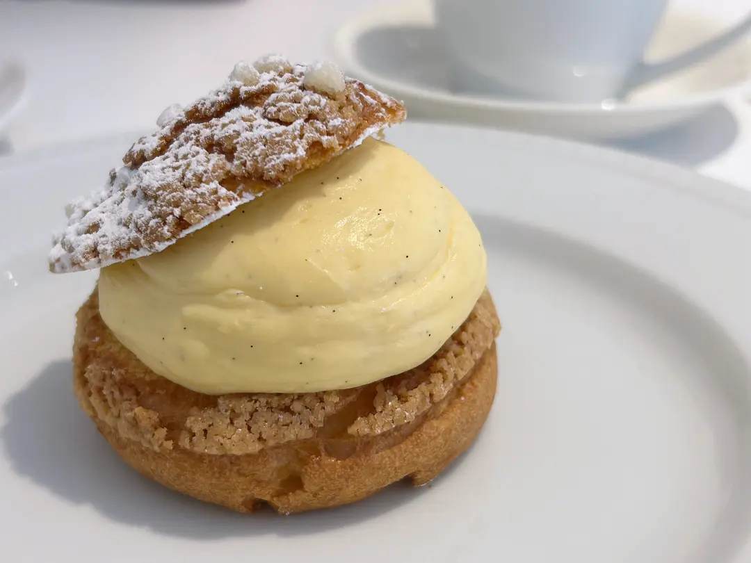 しっかりとした固さのあるシュー生地で、タマゴ感がはっきり感じられるクリームはやさしい味わいで、甘さは控えめ。アメリカーノと合わせると、シュークリームの甘みがちょうどよく引き立つ。デザートとして絶妙なバランスとおいしさ。冷えていたこともあり、全体として輪郭のある食感でした。