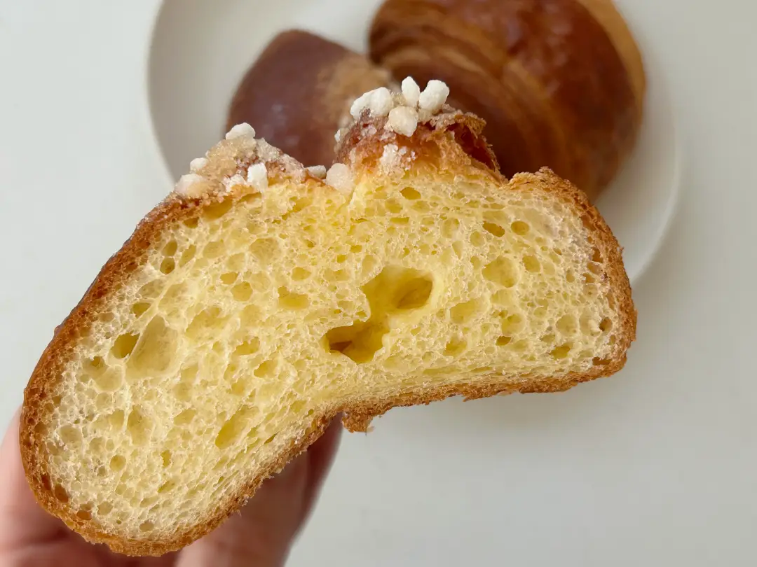 やや黄色みがかった生地。食べてみると軽くて、ふんわりとした口当たりで歯切れもよい。カフェラテと相性がよさそう。