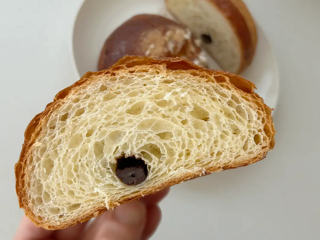 中にはビターなチョコレート。バター感も十分で、生地の食感は「パン寄り」の印象。派手さはないが、基本に忠実で安心感のある味わいでした。こちらもカフェラテが合いますね。