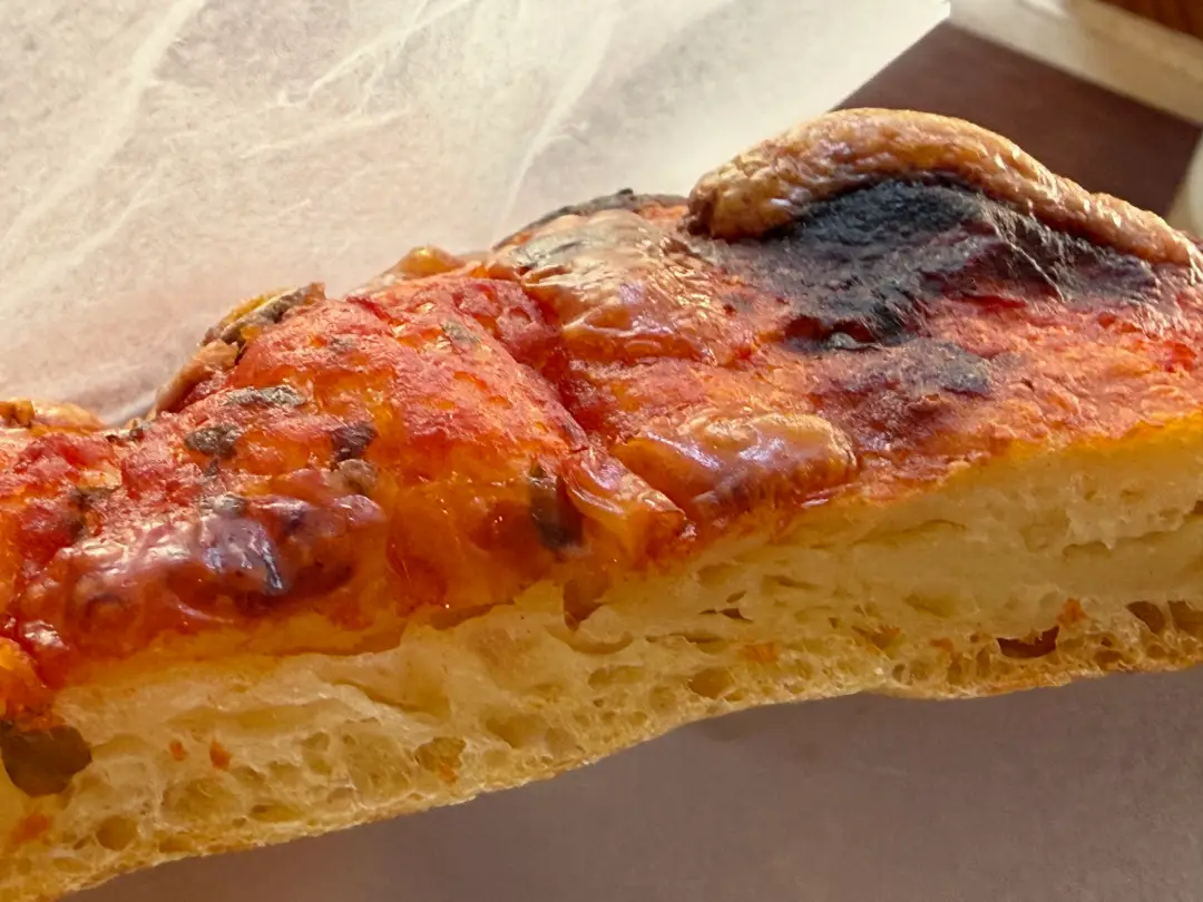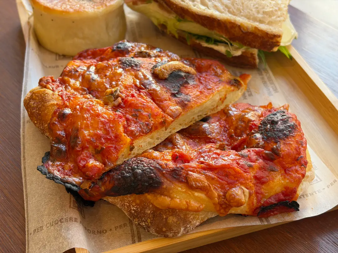 出来立て。大きなチャバタに、鮮やかなトマトソースがたっぷりとペーストされています。生地はもちもちで、端の部分のカリカリとした食感もたまりません。